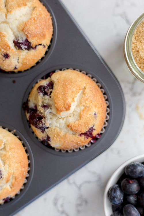 The final secret to these Blueberry Sour Cream Muffins is to generously sprinkle the tops with turbinado sugar prior to baking. You could also use demerara sugar or sanding sugar- you want that coarse granule both for the texture and aesthetic.